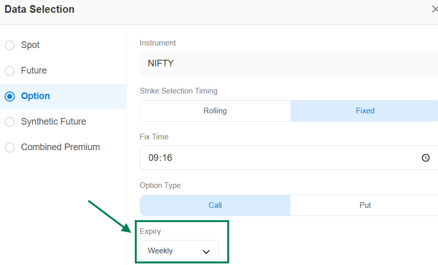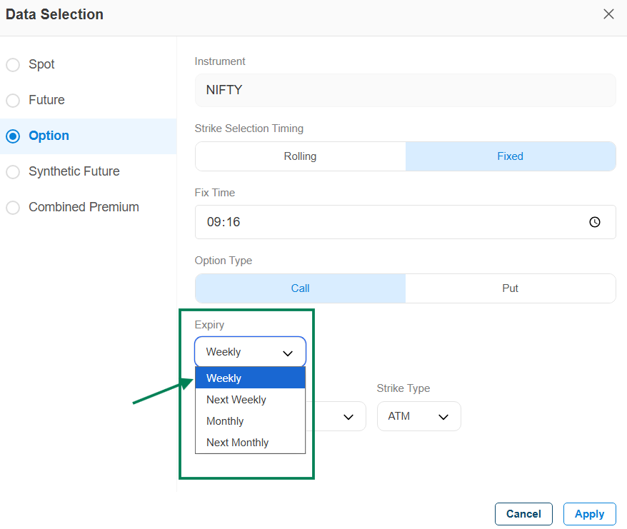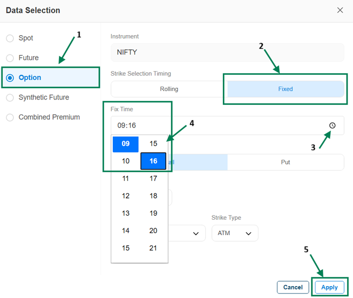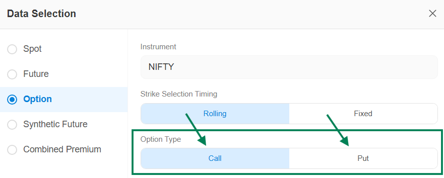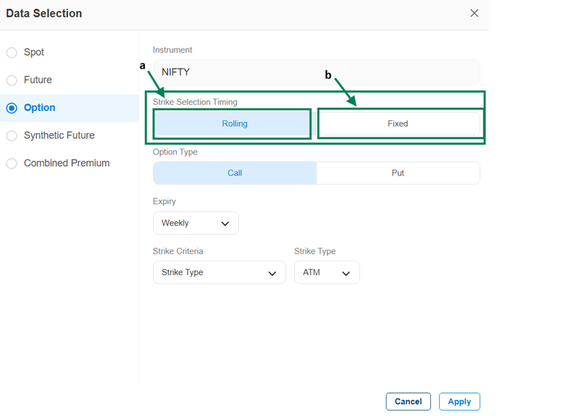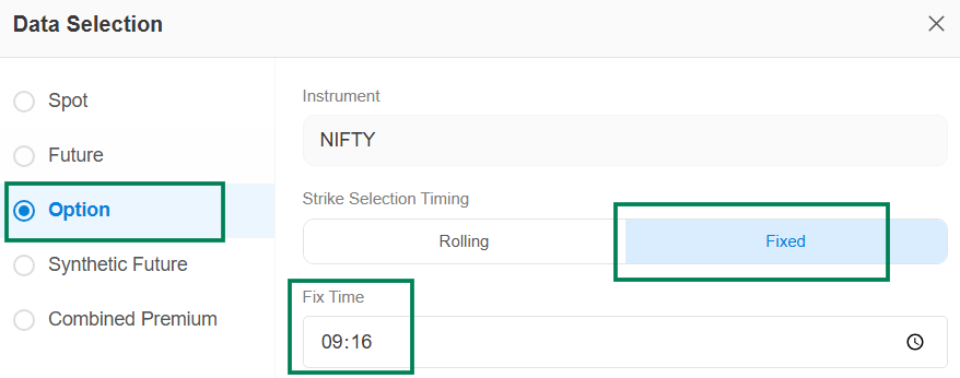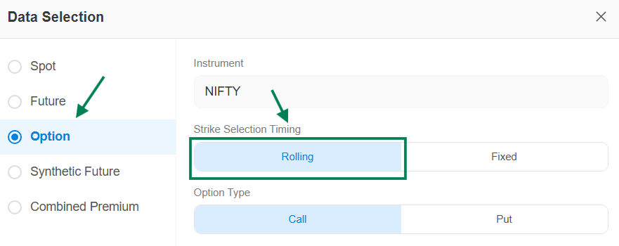 Strike selection Timing : Either you can select Rolling or Fixed Data Type.