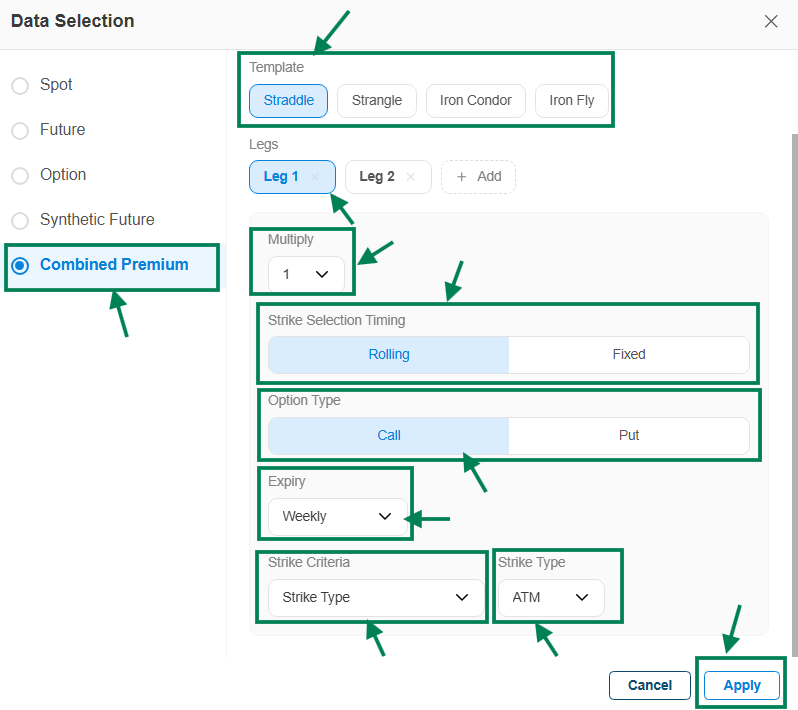 - Once you click on Spot Data selection drop down - the Data Selection window will appear → Click on Combined Premium, then select the required options. Legs will be created based on the selected template.
