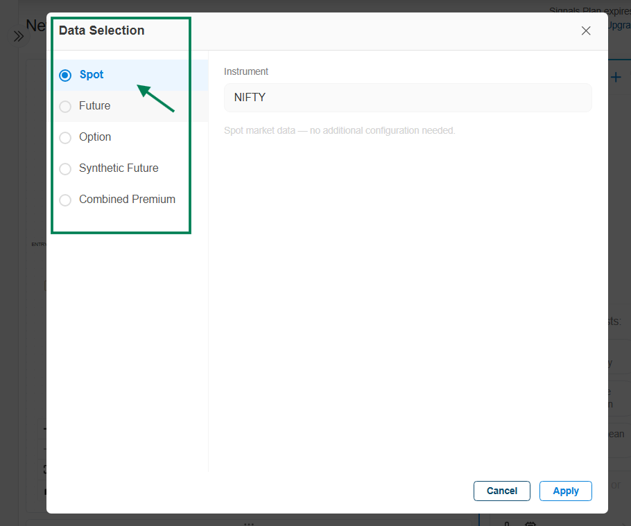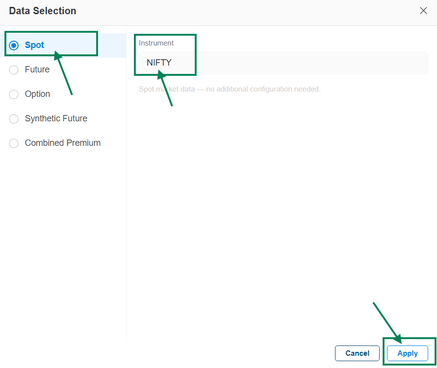 - Data Selection on Spot (Underlying) chart: Indicators are applied on the underlying cash/index chart price data. It is suitable for generating indicator-based signals on indices and stocks, and can be used on both index and stock charts.