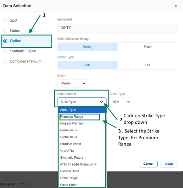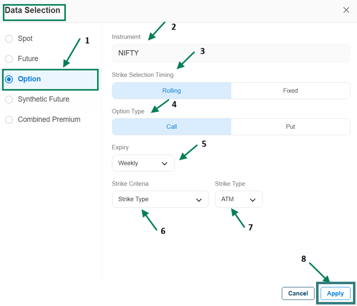 Set Multiply (default is 1, can be changed if required), choose Strike Selection (Rolling or Fixed), select Option Type, Expiry, Strike Criteria, and Strike Type, and finally click on Apply.