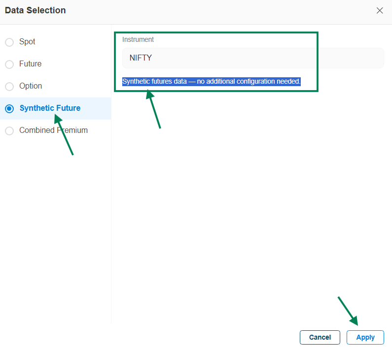 Then Data selection will appear - Click on Synthetic Future and apply. Note: Synthetic futures data - no additional configuration needed.\