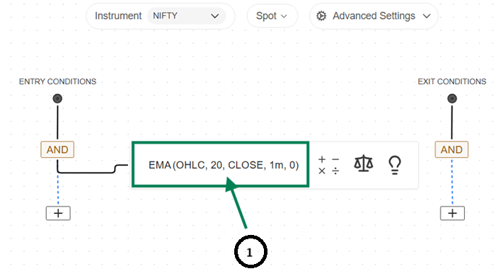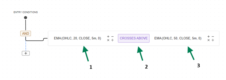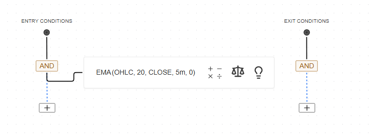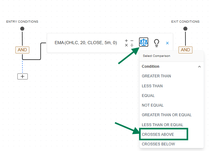 Click on β+β under Entry Condition, select Comparison Node, and add EMA (20) with inputs: Candle Type (OHLC), Source (Close), Period = 20, Timeframe (e.g., 5m)