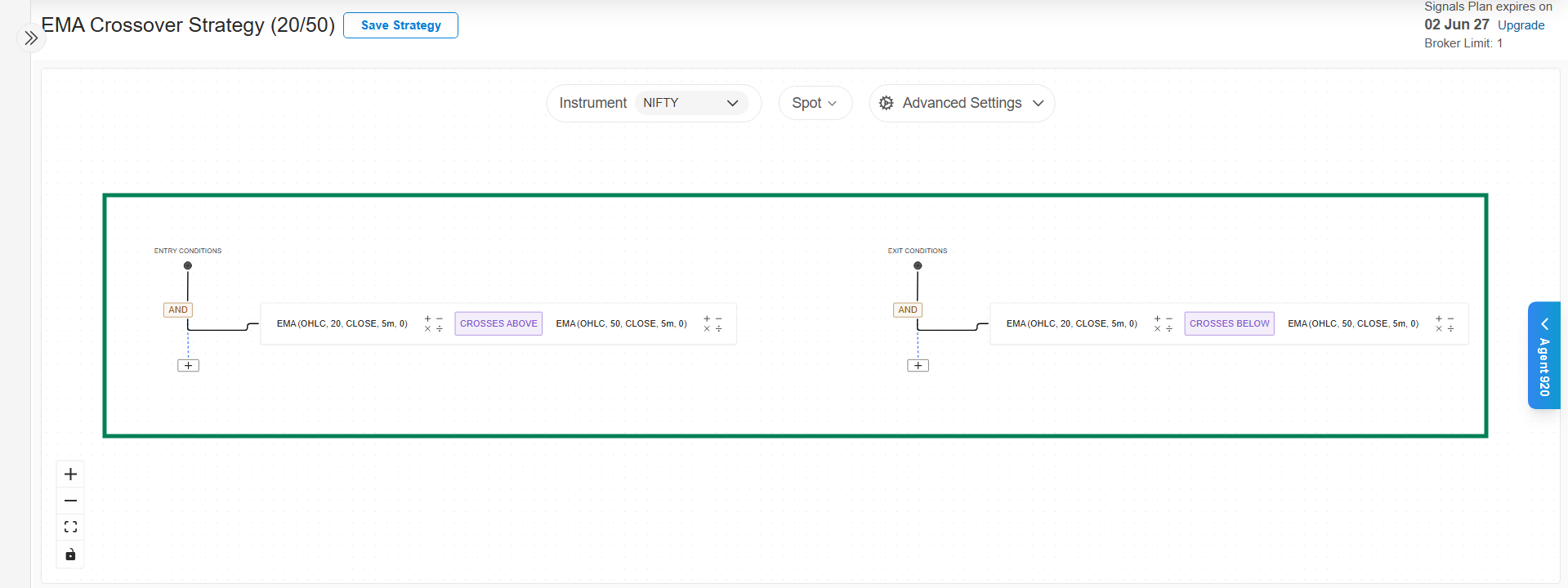 This creates the final Signal strategy: Buy when EMA 20 crosses above EMA 50 and exit when it crosses below on a 5-minute timeframe.