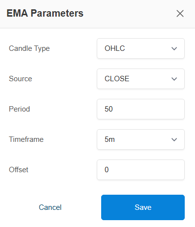 β Search and select EMA, then set Indicator settings accordigly EMA 50 and save.