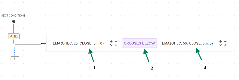 Click on β+β under Exit Condition, select Comparison Node, and add EMA (20) with inputs: Candle Type (OHLC), Source (Close), Period = 20, Timeframe (e.g., 5m)
