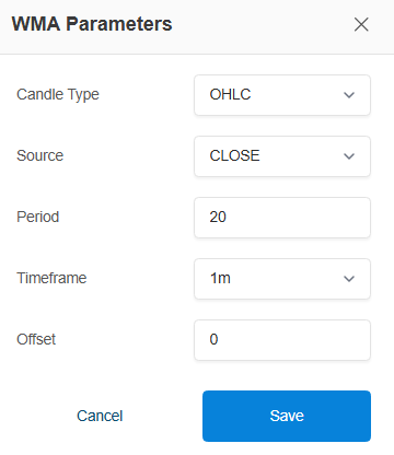 β Here are all the available settings for the WMA ( Weighted Moving Average) indicator: