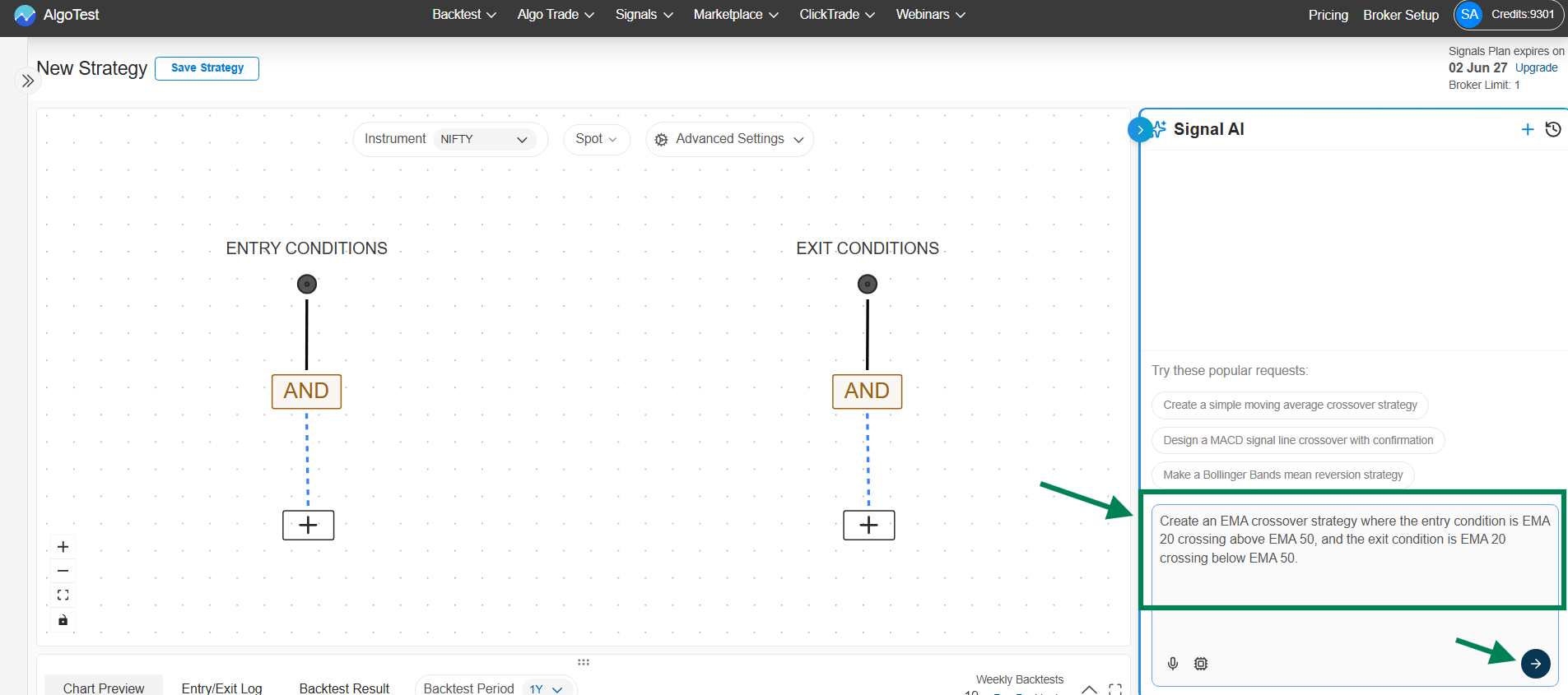 Enter: After entering your strategy, press Enter to generate an indicator-based strategy.Â