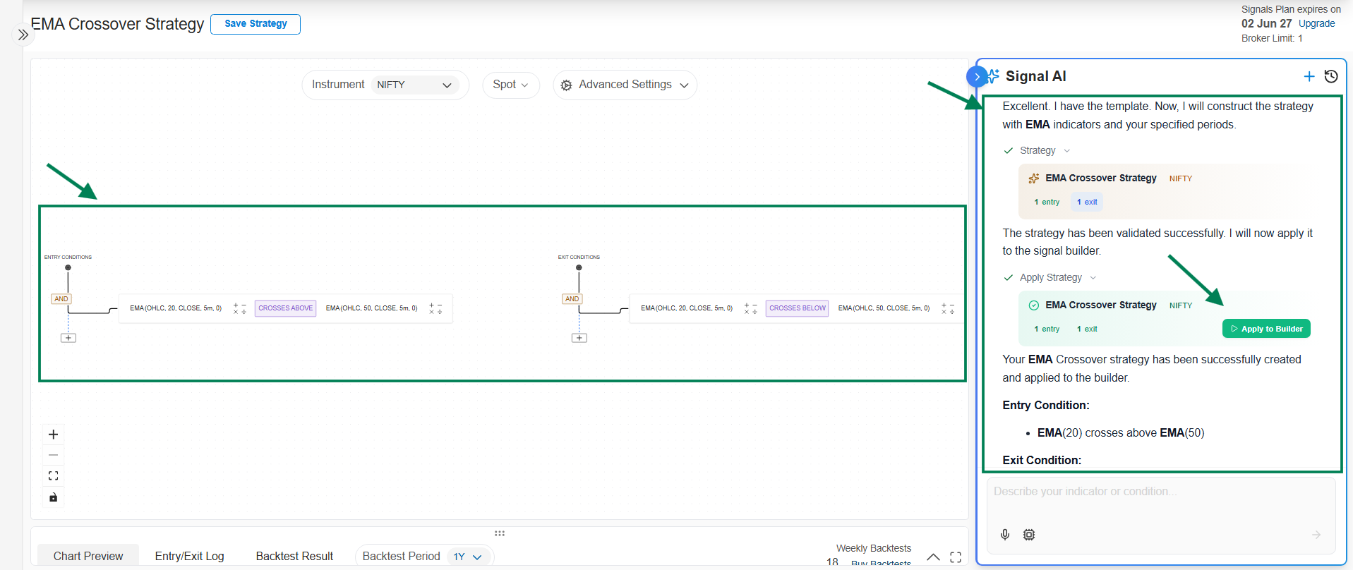 The Signal AI Chatbot helps users quickly create trading strategies by simply describing their logic in plain English. It automatically converts user inputs into structured conditions on the Signal canvas.
