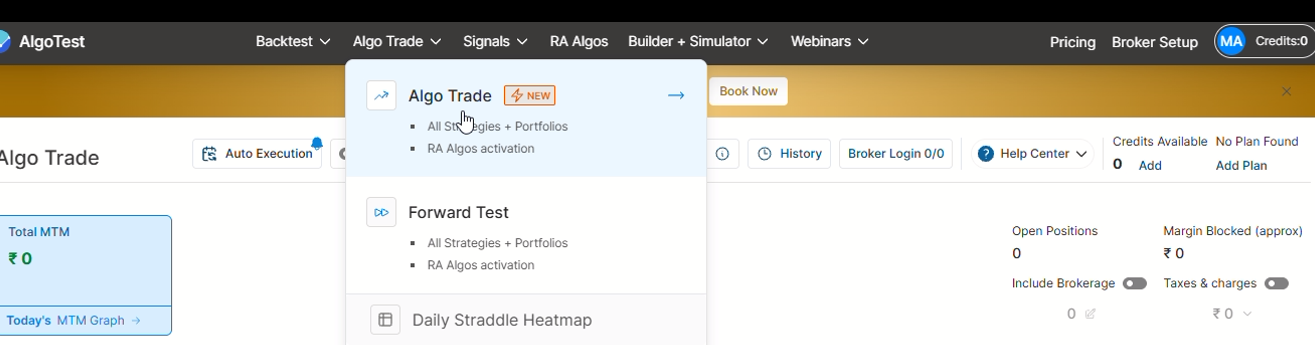 Please navigate to the "Algo Trade" page in Algotest by clicking on the corresponding button as displayed in the image below.