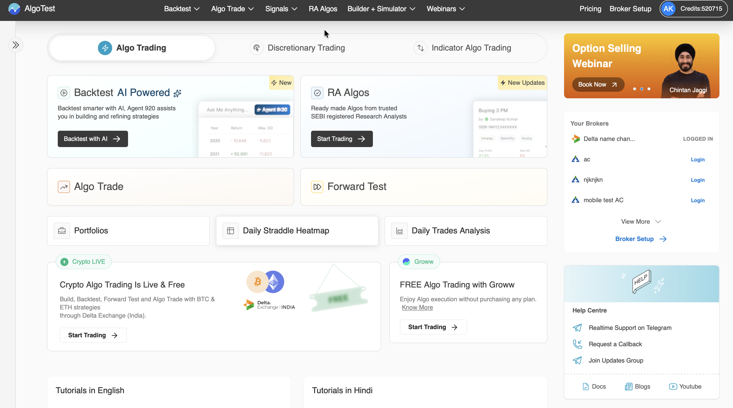 - Visit AlgoTest and log in to your account. The dashboard will be displayed as shown in the image below.