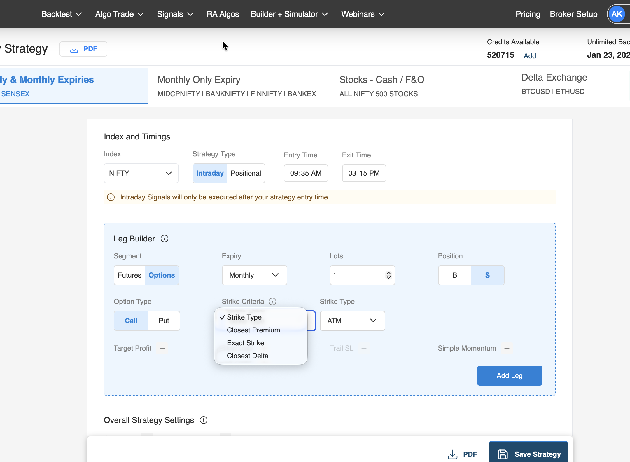 - Now, in the Leg Builder, you can choose the "Exact Strike" option from the dropdown menu under the strike criteria, as illustrated in the image below.