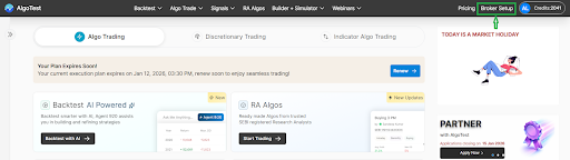 After logging in to your AlgoTest account, you need to log in to your broker in AlgoTest. To log in to your broker follow some simple steps as shown below.