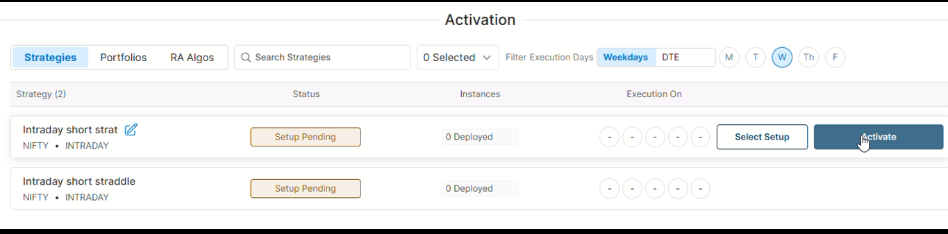 Click on the Activate button to activate your strategy. Assume we want to activate a strategy named ‘AlgoTest Forward Test 2’. So we will click on the ‘Activate’ button on the right side of the strategy. It is important to note that you have to activate your strategy daily and you can activate your strategy between 08:00 AM and 03:28 PM. You have to activate your strategy at least 2 minutes before your entry time.
