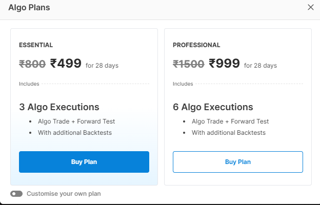 - You get 3 Algo Activations (Algo Trade + Forward Test) for ₹499 for 28 days and 6 Algo Activations (Algo Trade + Forward Test) for ₹ 999 for 28 days.