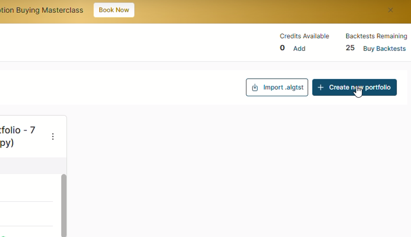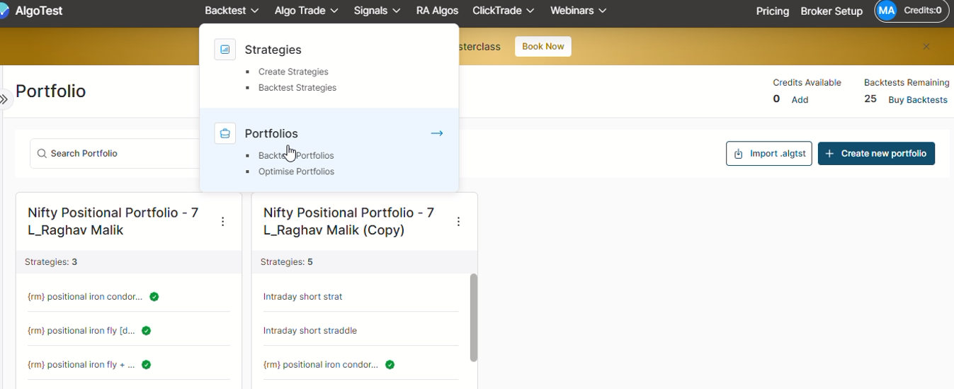 - Visit the AlgoTest website and click on the "Portfolios" button, as shown in the image below.\