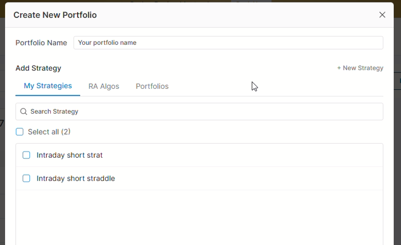 - Now select the strategies you want to backtest together, give a desired name to your portfolio, and click on "Create Portfolio." You can also create a new strategy by clicking on the "Create New Strategy" button.
