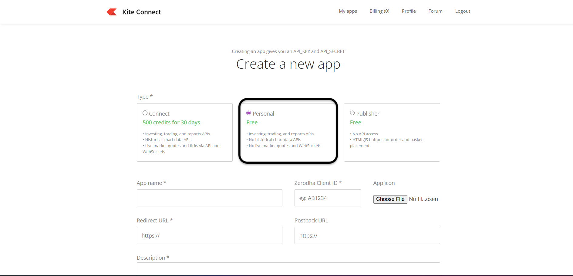 To proceed, first select "Personal" and then enter a random name in the "App Name" field. Next, paste the Redirect URL that we copied in step 3 from the AlgoTest broker setup page into the "Redirect URL" box. Enter your Generic Broker Client ID in the "Client ID" box, leaving the "Postback URL" field blank. In the "Description" box, enter any random description. Finally, click on "Create".