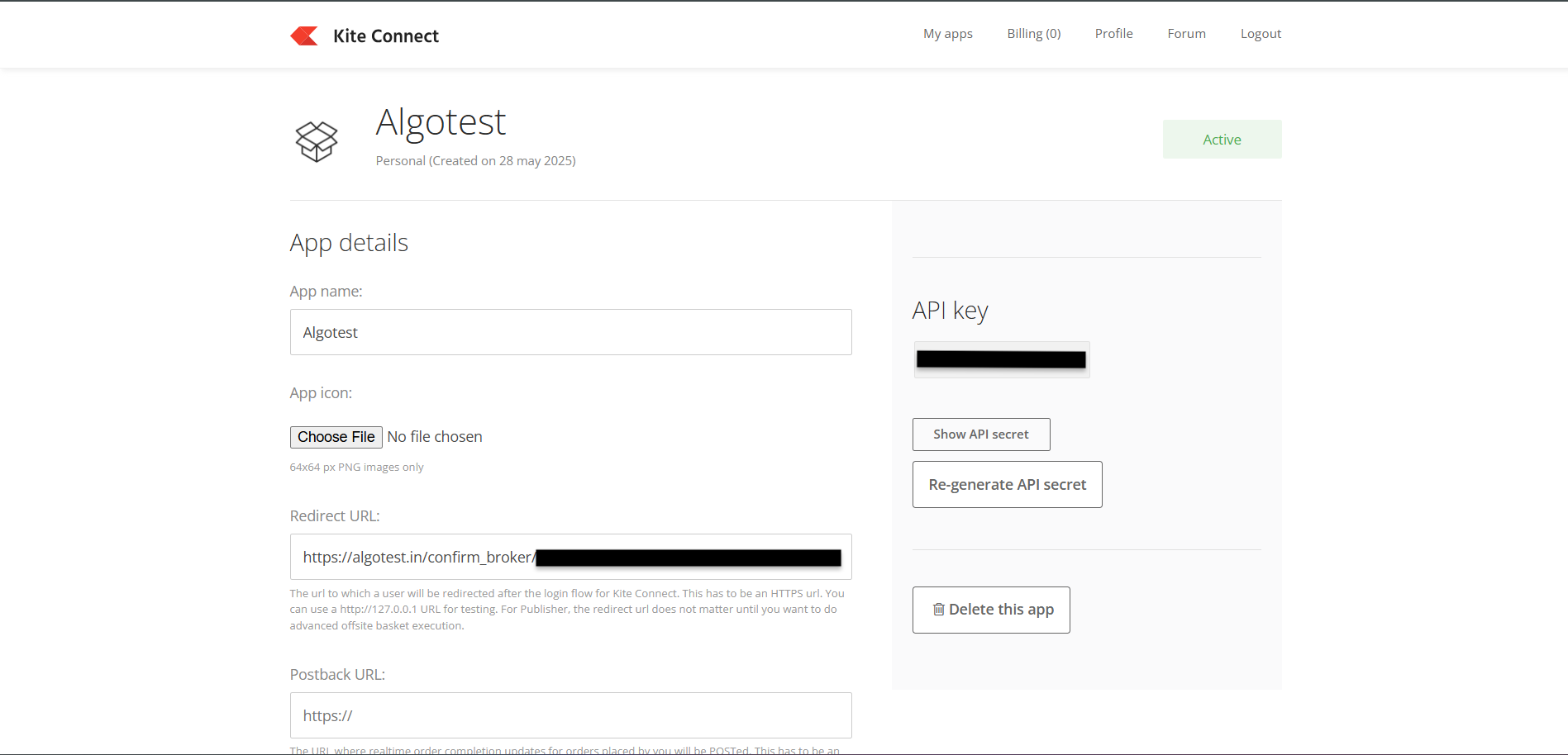 Copy and paste the API key and secret into the AlgoTest broker setup page.