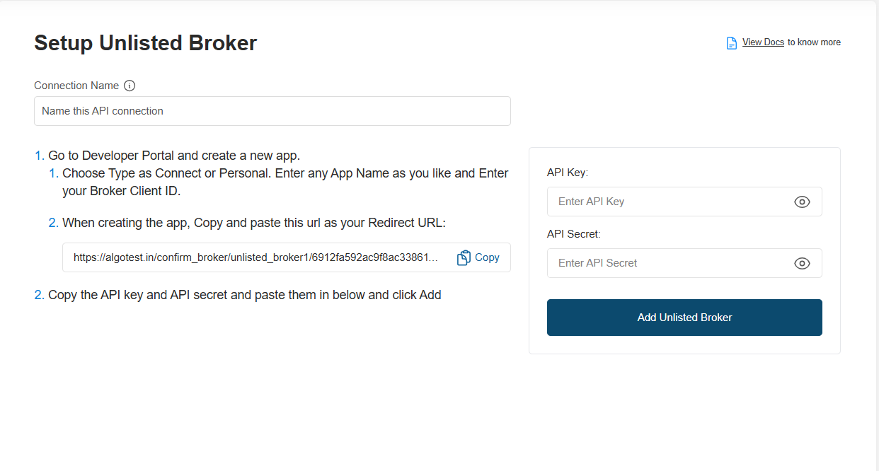 - To connect Generic Broker with AlgoTest, we need an API Key and API Secret. In order to obtain these, we will create an App in the Generic Broker Developer Portal. To get started, simply copy the redirect URL using the copy icon as shown below. This URL will be used while creating your API App in the Generic Broker Developer Portal in the next steps.