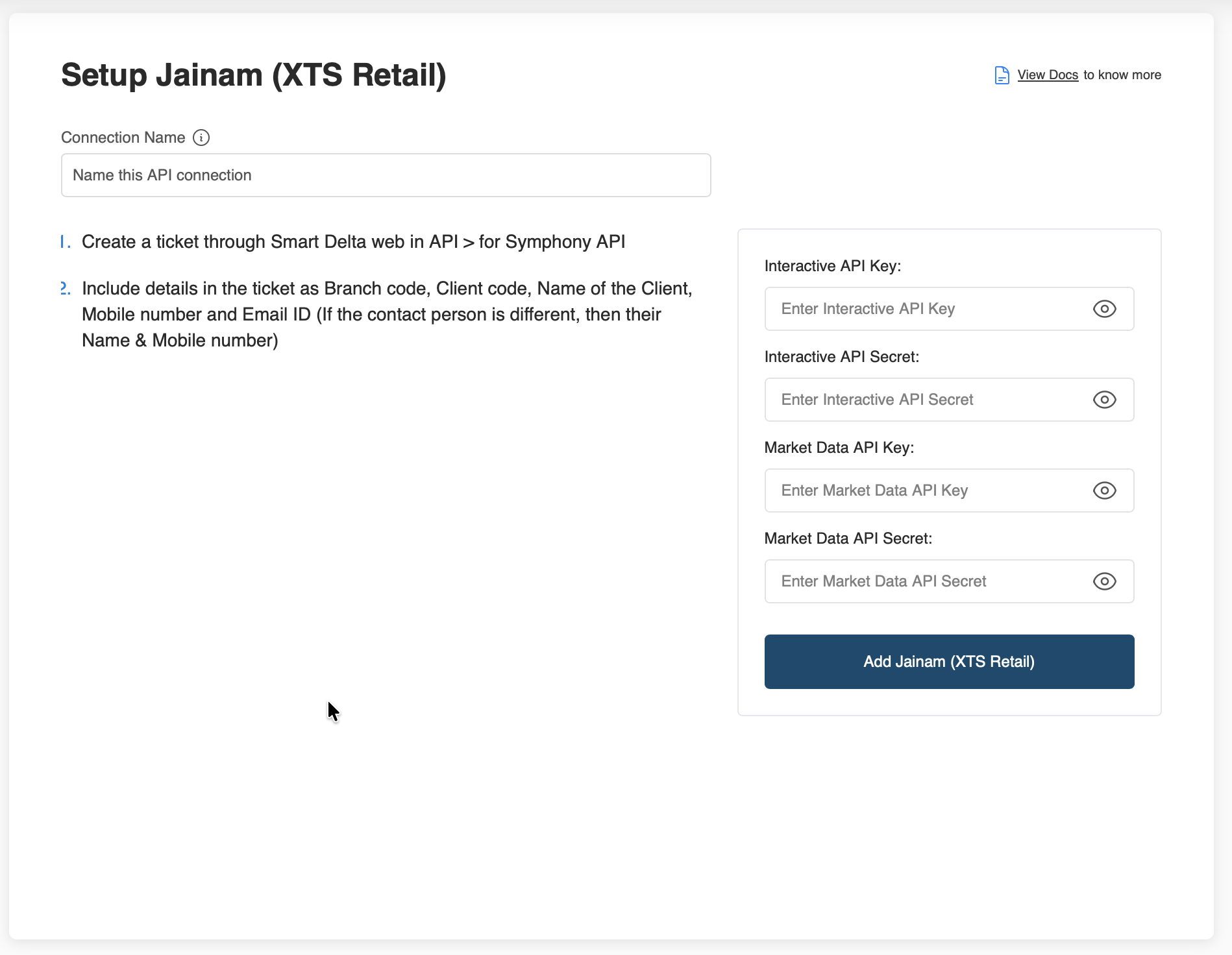- To get these API Keys and API Secrets, activate Symphony XTS API on your account. To activate Symphony API, create a ticket through Smart Delta Web in API. Include the following details in the ticket.