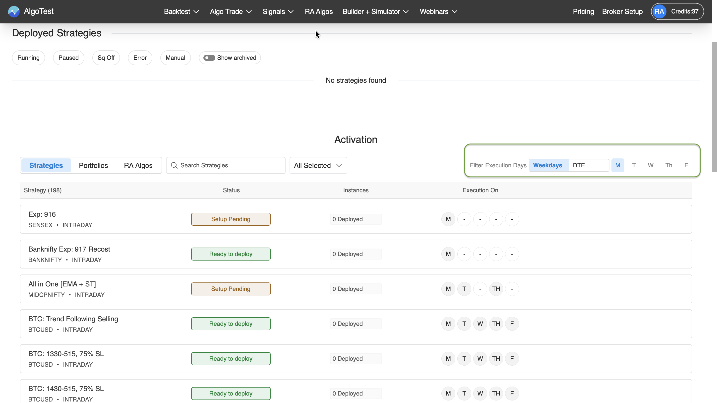 This feature can only be used to filter out your strategy on the live trade page in a group of strategies based on the day. It doesn't mean that they will be auto-activated according to the day you select. You need to activate your strategy daily except Signal Strategy.