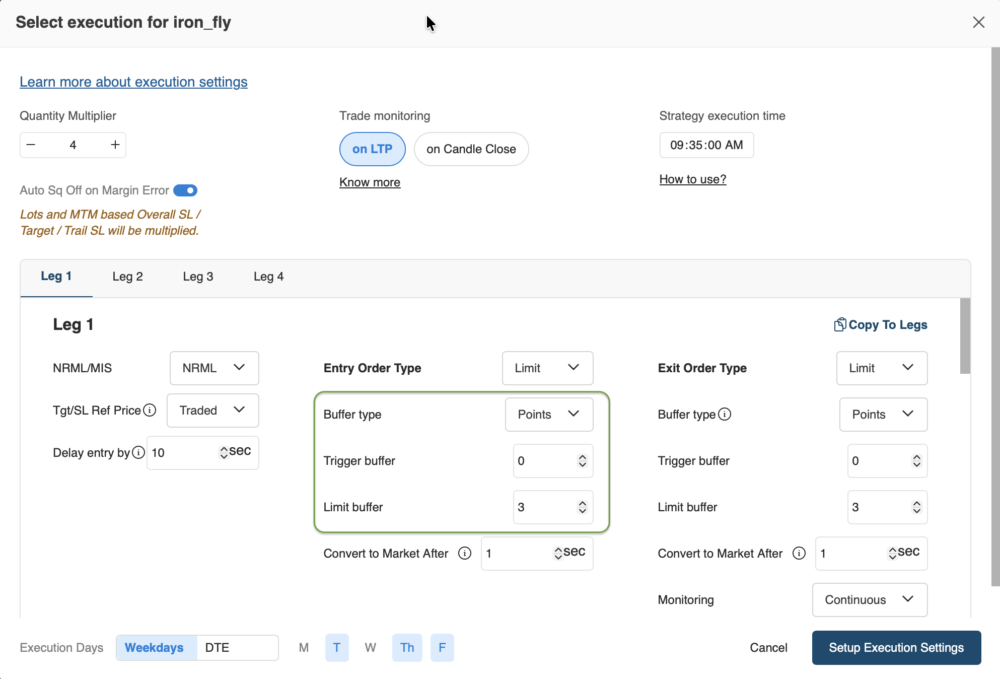 Time-Based Entry: A Limit order based on the LTP along with the limit buffer is sent at the time of entry. The Limit Buffer is added in case of a Buy order while the Limit Buffer is subtracted in case of a Sell order.