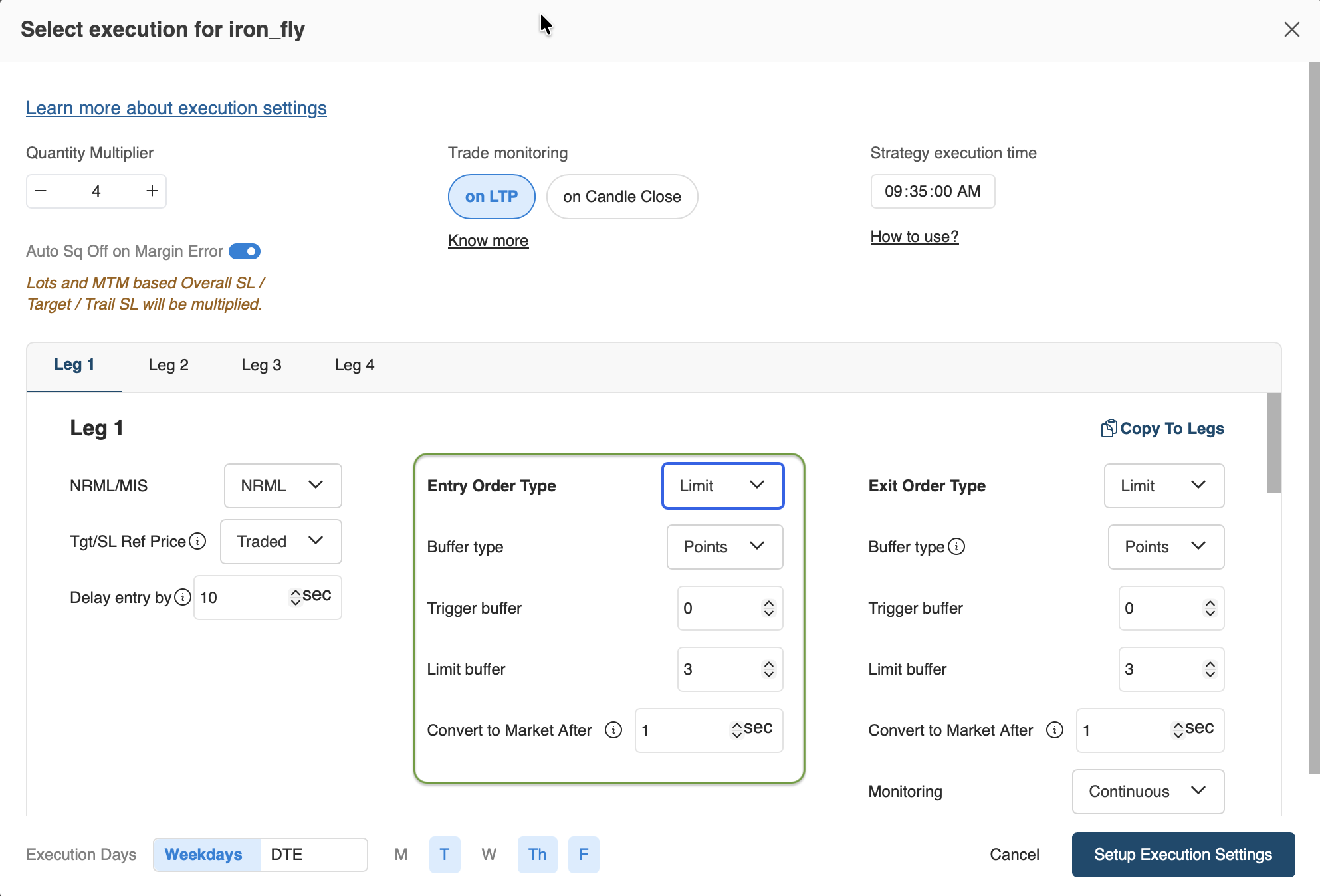 Re-Momentum on Instrument: Limit/SL-L order sent in advance to your broker based on the set momentum as soon as the previous leg exits.