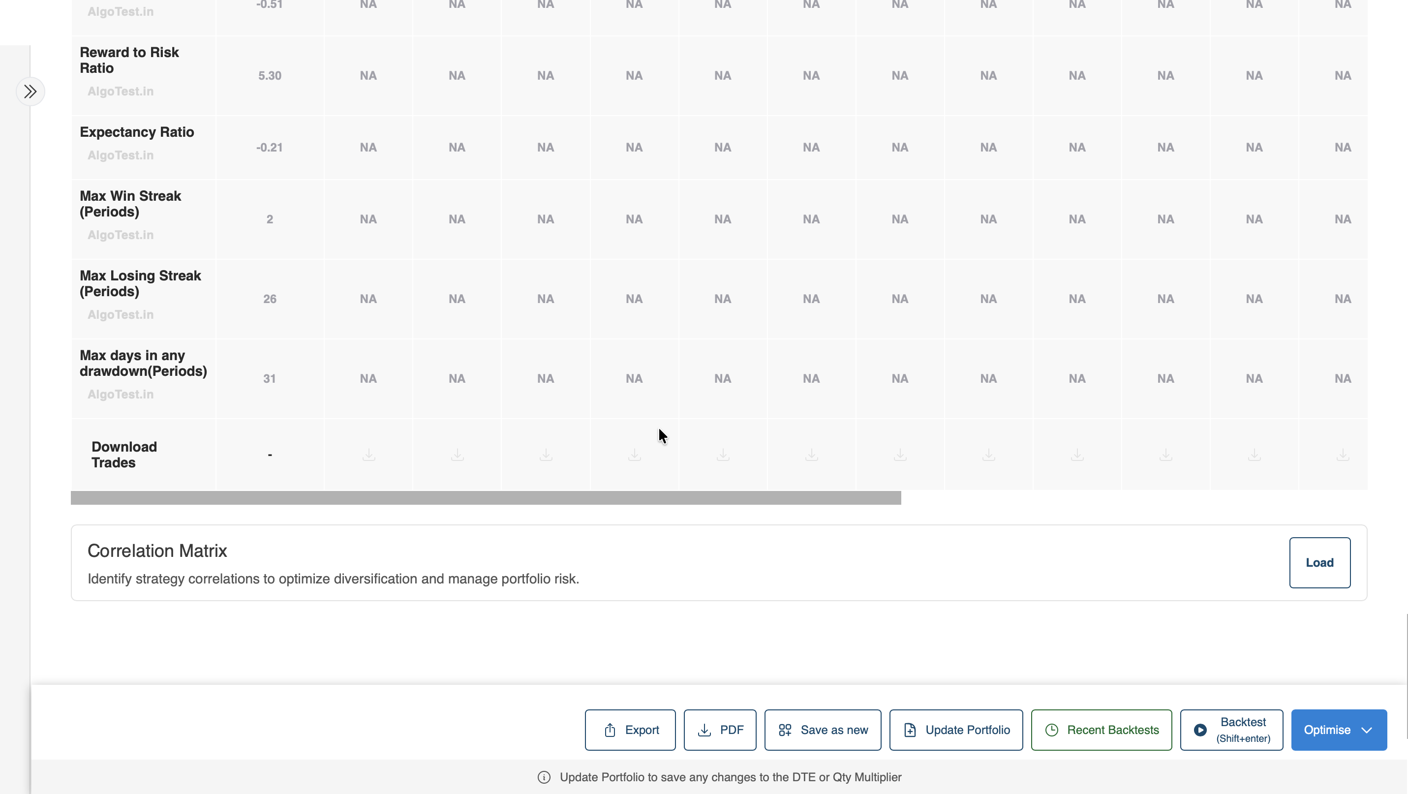 In the image below, you can observe that the strategy named "Finnifty Exp: maf" has a negative correlation of -0.15 with the strategy named "Finnifty Exp: Afcp1". Therefore, it would be a beneficial strategy to add to our portfolio for diversification.