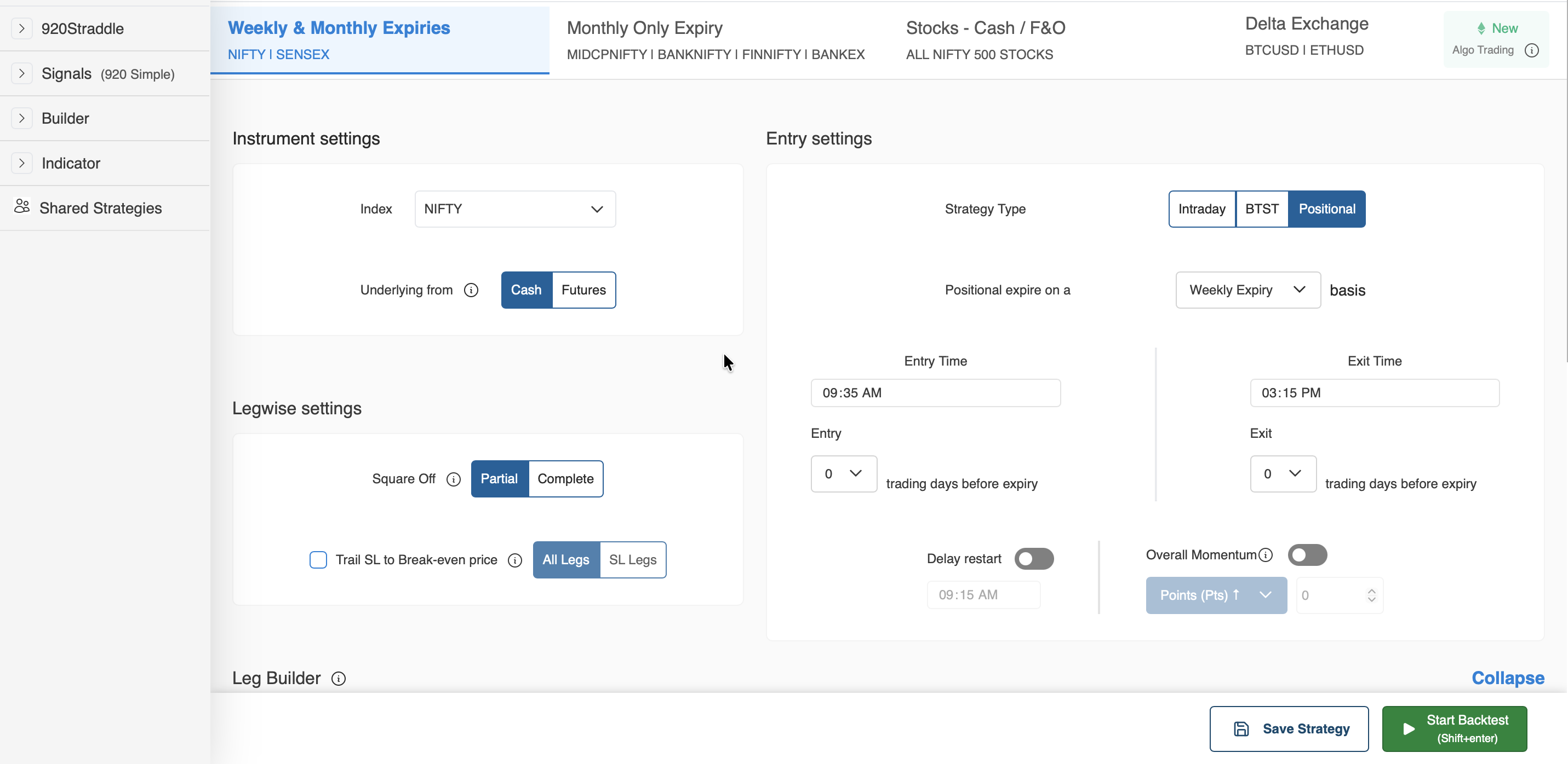 - Rest of the settings will remain the same. You just have to add legs in your strategy and save by clicking on the save strategy button as shown below.