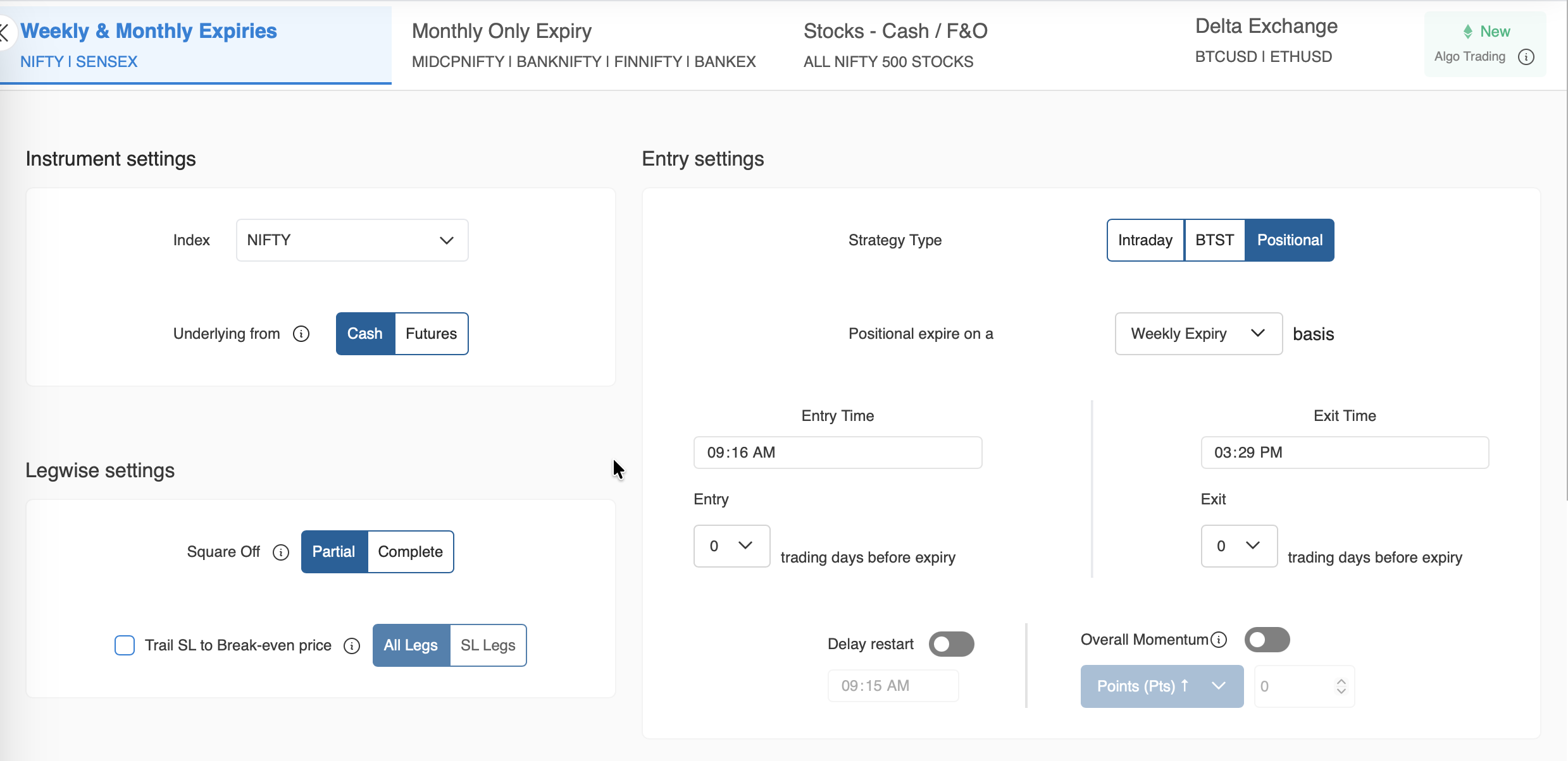 - Make sure to select 0 trading days before expiry in entry and in exit both as shown in the image below.