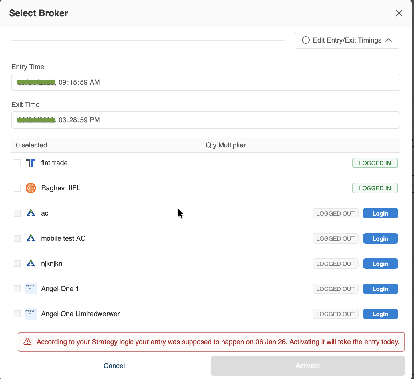Timing of broker login and strategy activationβ