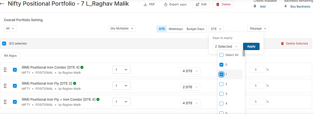 Similarly, select the days the algo should be deployed from the DTE filter.