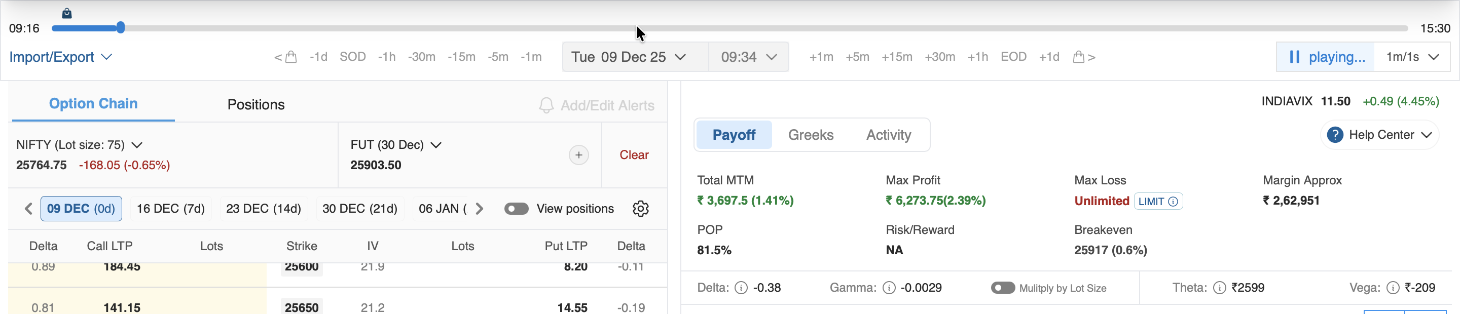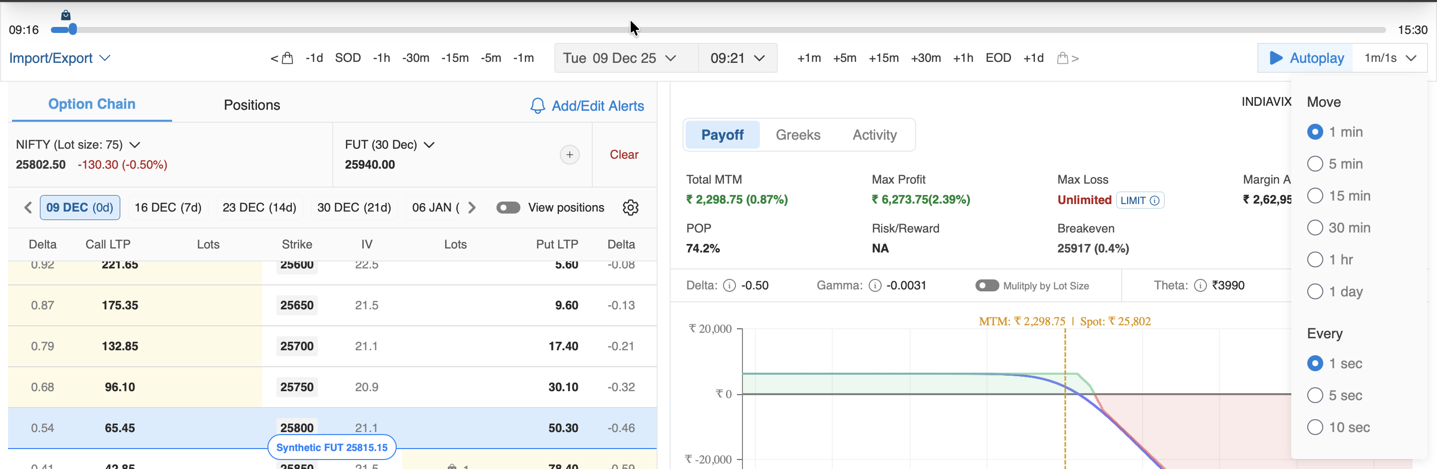 To simulate your strategy, go to the Option Chain section, where you can view available options for different underlying assets. Select your desired positions to set up your simulation and evaluate your strategy's performance under various market conditions.