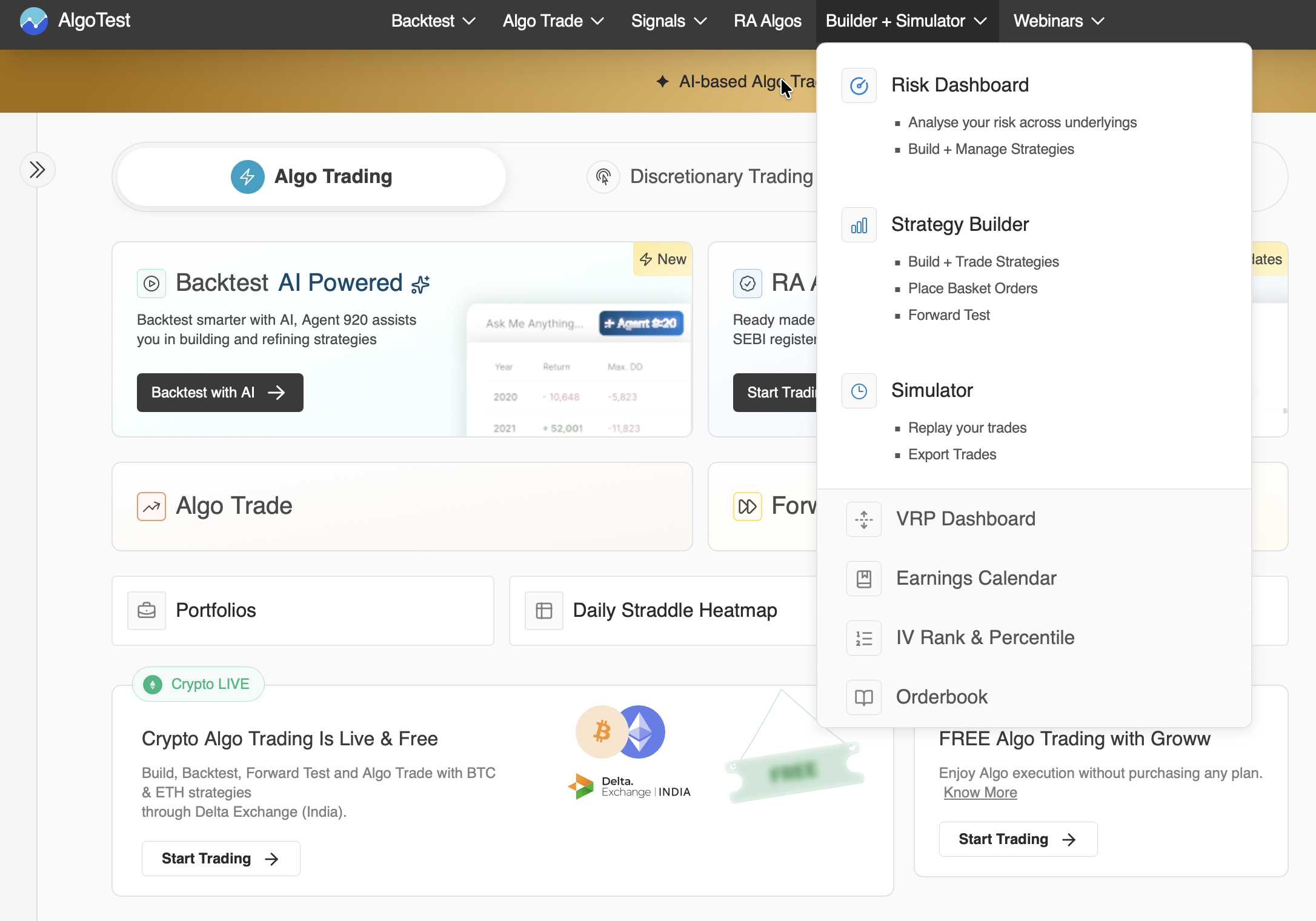 - Login to AlgoTest.in and click on the Strategy Builder button as shown in the image below.